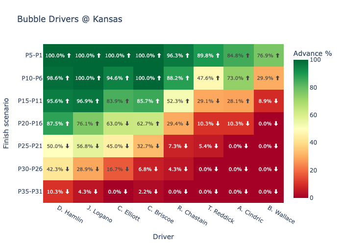 Chastain’s modest overperformance has only slightly decreased his odds by 6%, while the Chase’s modest overperformances have allowed them to hold on for another week. Let’s see how each of the drivers with <85% chance of advancing need to finish at Kansas to protect themselves from the ‘wildcard’ of the Roval.