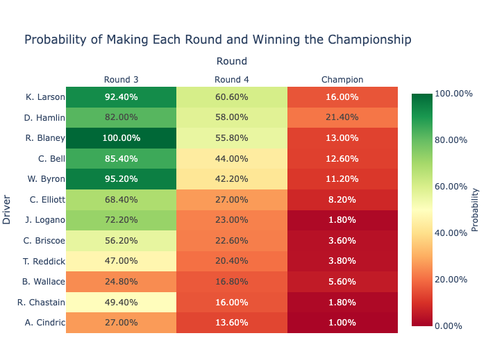 After an unexpectedly strong showing from Penske at Loudon, and underwhelming performances from Toyota, the cutline bubble has begun to form more clearly. Blaney, Byron, and Larson all now have a greater than 90% chance of advancing; while Hamlin and Bell both have more than an 80% chance of advancing. Looking forward, Denny is now the first to have more than a 20% chance of winning the championship.